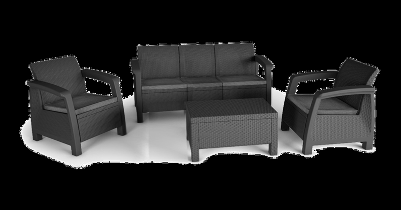 Keter bahamas outdoor 5 seater corner rattan sofa furniture set with table, graphite with grey cushions.